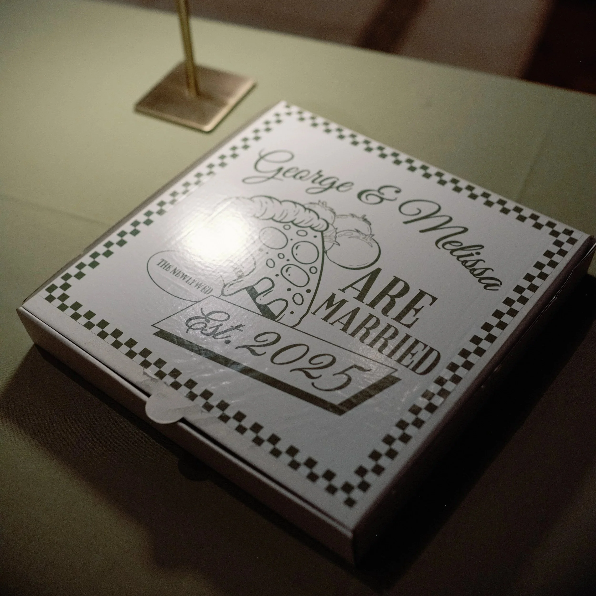 Green tea shots flowed. A custom chip bar paid homage to the groom’s love of spicy chips. Late-night pizza—delivered by Domino’s—arrived in custom-designed pizza boxes created just for the occasion (because George and Mel really love pizza).