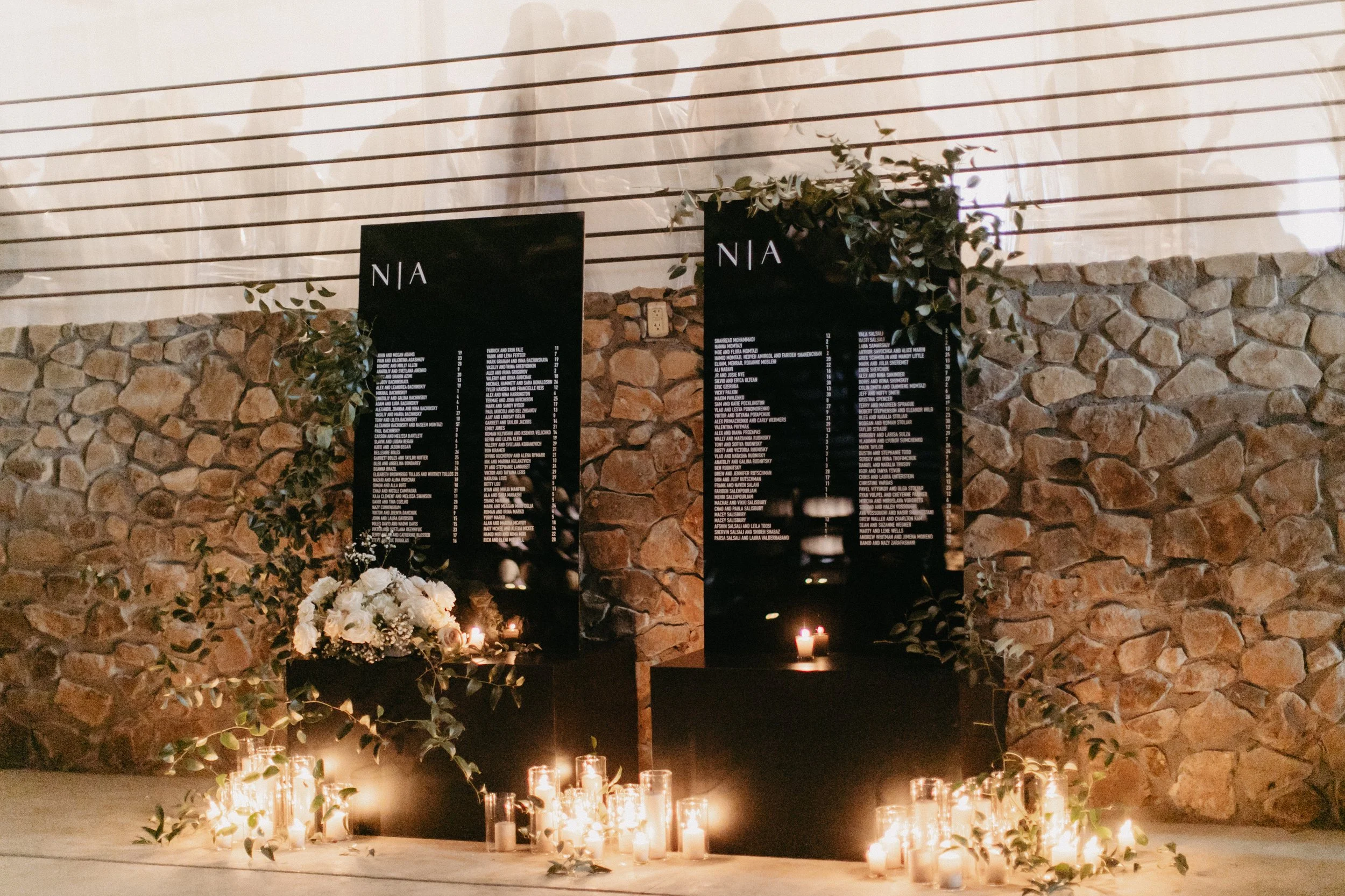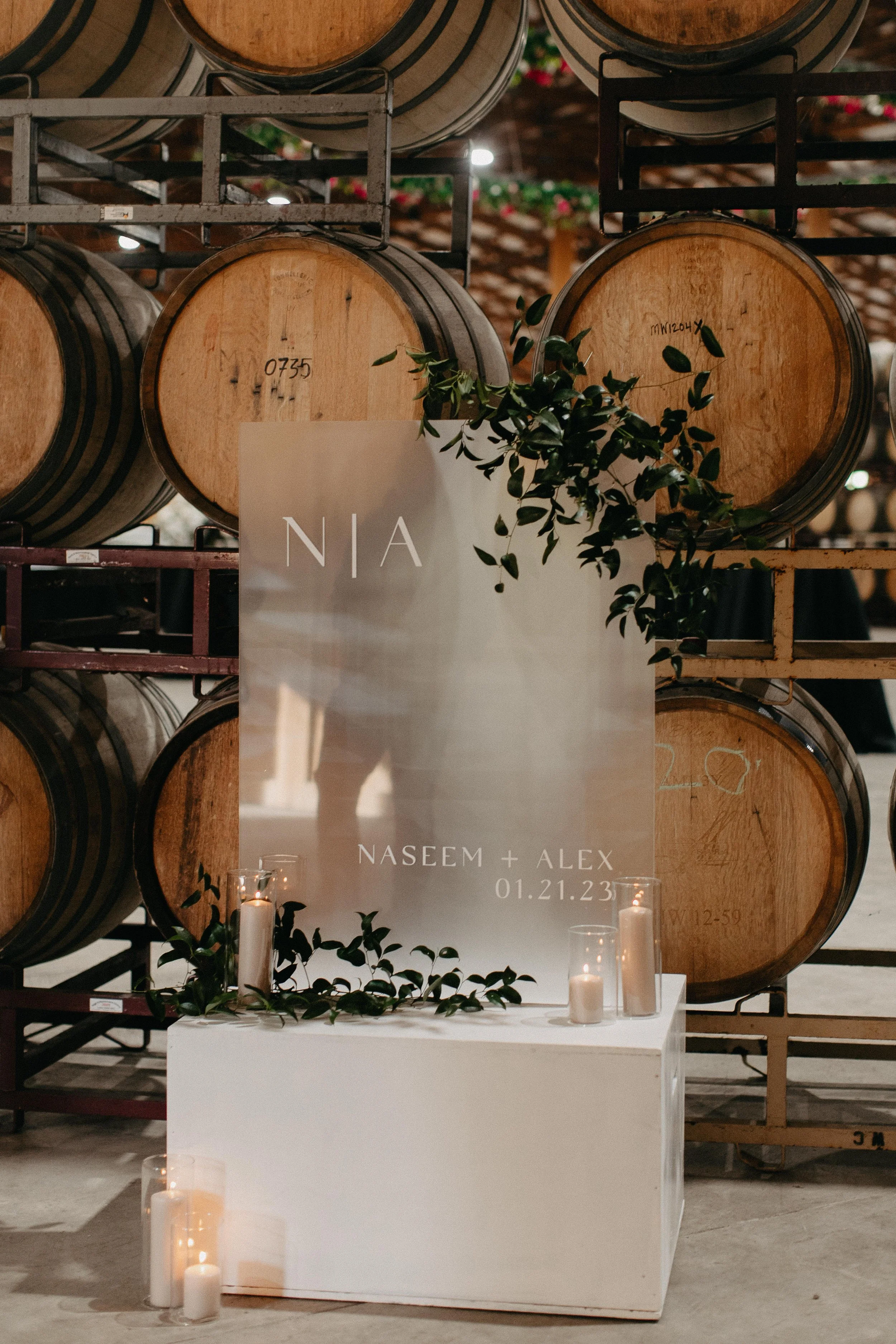 Guests were transported into a moody yet inviting cocktail hour on the winery’s crush pad, where barrel walls were illuminated from within, adding a touch of warmth to the cool winter evening. Black velvet lounge furniture created a chic retreat, perfectly complementing the black custom-built bar—crafted by the groom himself. Adding a deeply personal touch, the groom also designed custom stone signage, a nod to the way their love story began: when he first came to install the bride’s kitchen countertops, conveniently “forgot” his tools, and stayed for dinner. The rest, as they say, is history.